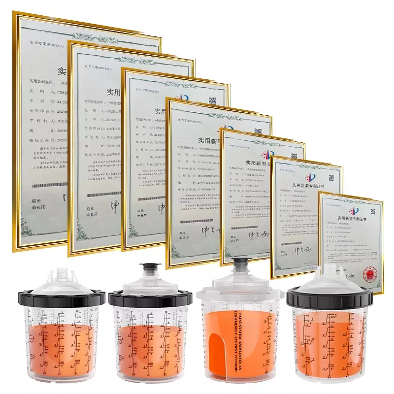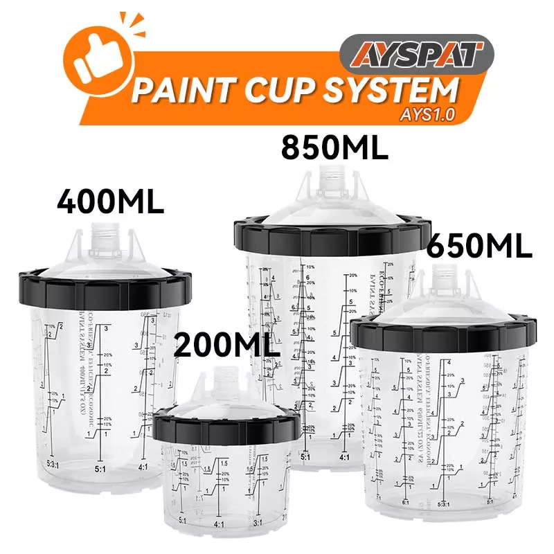 Systém jednorazového sprejového pohára AYSPAT sa skladá z piatich častí: vonkajšieho pohára so stupnicou, jednorazovej PE vložky, viečka s filtrom, goliera spájajúceho pohár a viečka a zátky so základňou. Tento systém kombinuje viaceré funkcie, ako je miešanie farieb, filtrovanie, striekanie, skladovanie, zjednodušuje proces predprípravy na striekanie a šetrí náklady na nákup samostatných papierových lievikov a nádob na miešanie farieb.