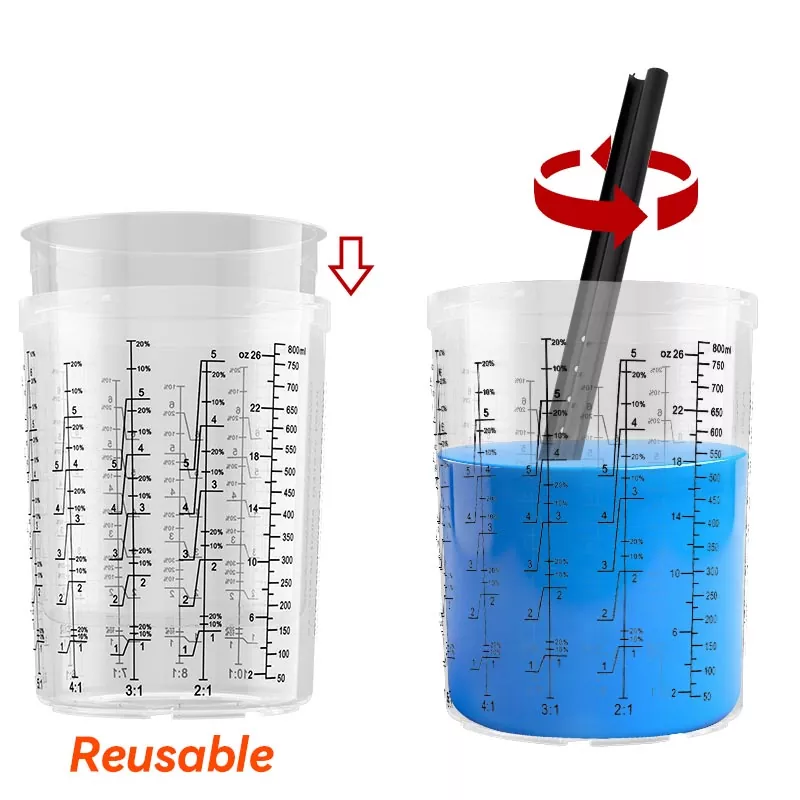 Opätovne použiteľný vonkajší pohár so stupnicou miešacieho pomeru. Vložte jednorazovú vložku do vonkajšieho pohára a premiešajte farbu priamo vo vložke. Znížte náklady na materiál nepoužívaním tradičného miešacieho pohára.