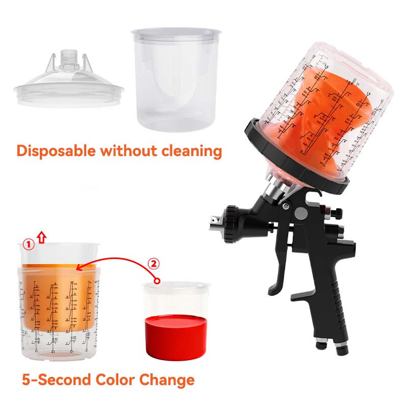Thejednorazový pohár na striekaciu pištoľ po použití nevyžaduje čistenie; jednoducho vyhoďte vnútorný pohár, aby ste rýchlo zmenili farby, skrátili interval výmeny farby z 20 minút na 5 sekúnd, čím sa denná produkcia efektívne zdvojnásobila. Veko je vybavené vstavaným jemným filtrom, ktorý účinne filtruje nečistoty a zaisťuje rovnomerný a hladký sprej, výsledkom čoho je kvalitnejšia povrchová úprava.