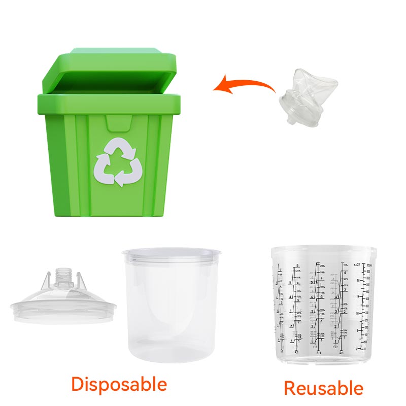 • Ľahký dizajn znižuje únavu:Váži iba jednu tretinu tradičných kovových pohárov,Jednorazové poháre na striekacie pištolevýrazne znižuje namáhanie rúk pri dlhodobom používaní.