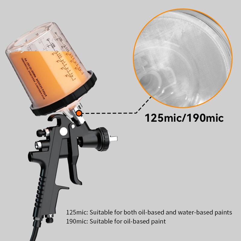 • Vstavané integrované filtre pre vynikajúcu povrchovú úpravu laku: Jednorazový uzáver sprejovej nádobky obsahuje vstavané 190μ (olejová farba) a 125μ (vodná farba) filtre, ktoré účinne filtrujú nečistoty počas striekania a zvyšujú lesk farby o 20 %.